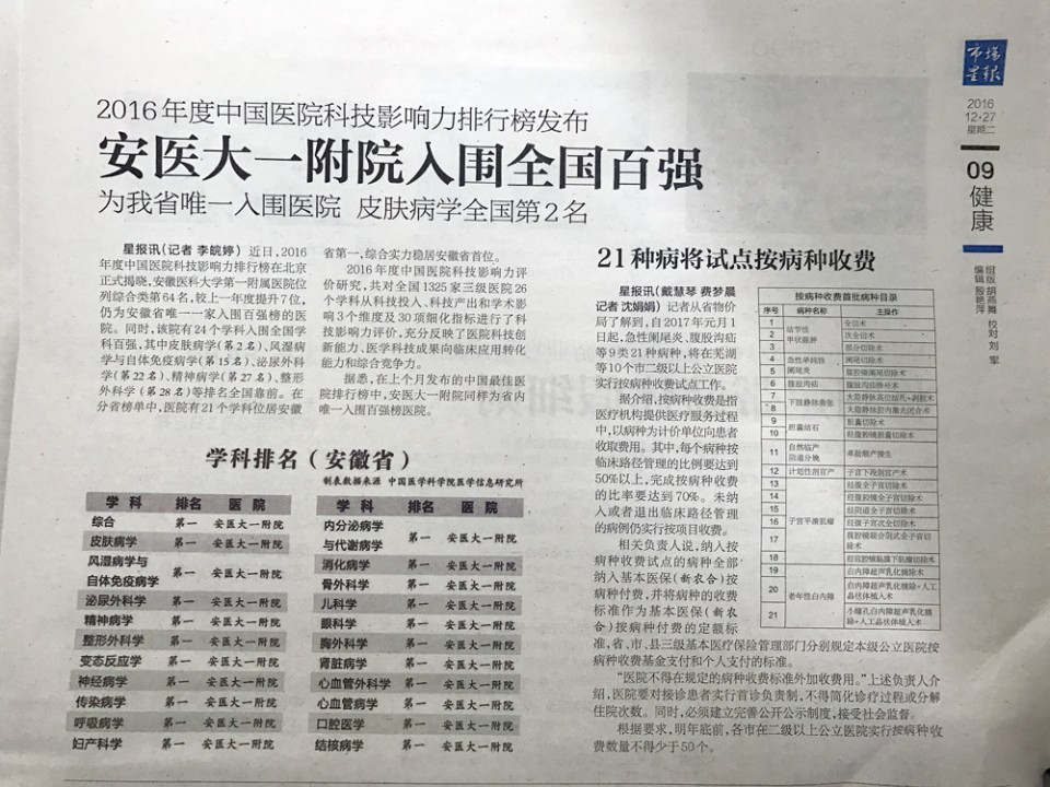 2016年度中国医院科技影响力排行榜发布 安医大一附院入围全国百强