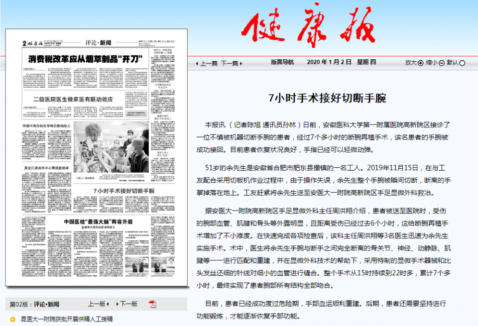 本报讯 (记者陈旭 通讯员孙林)日前,安徽医科大学第一附属医院高新院区接诊了一位不慎被机器切断手腕的患者,经过7个多小时的断腕再植手术,该名患者的手腕被成功接回。目前患者恢复状况良好,手指已经可以轻微动弹。