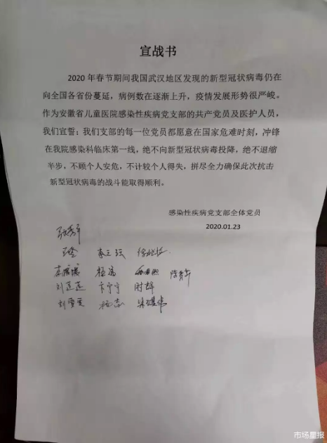 这两份宣战书,分别来自于安徽省儿童医院感染性疾病党支部和感染科,下面分别有14名党员干部职工和23名医护人员的签名。