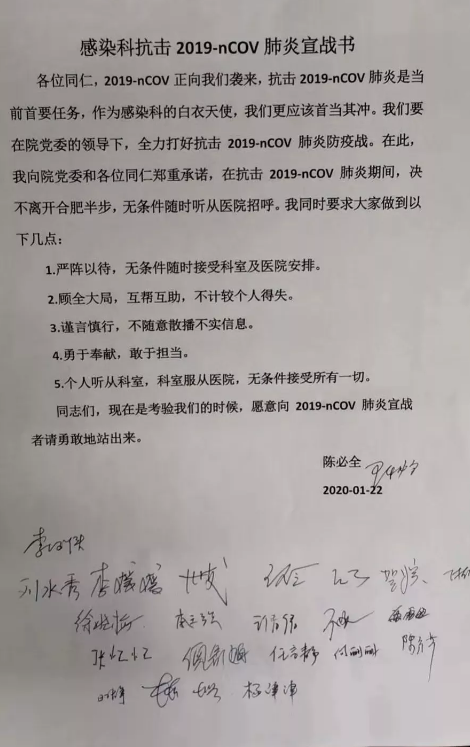 “2019-nCOV正向我们袭来,抗击2019-nCOV肺炎是当前首要任务,作为感染科的白衣天使,我们更应该首当其冲……严阵以待,无条件随时接受科室及医院安排;顾全大局,互帮互助,不计较个人得失……”