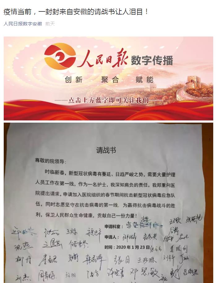 “我把飞机票退了,请战参加疫情防治!”安徽医科大学第一附属医院高新院区门诊部护士陈娟年前早已计划家庭外出旅游。但面对严峻的新型冠状病毒感染的肺炎疫情,她毫不犹豫地退了机票,奋战在抗击疫情的第一线。“我参加过非典防治,有经验,我志愿参加。”马寒香是安徽医科大学第一附属医院的一名护士长,她看到号召后,第一时间向医院交了请战书。