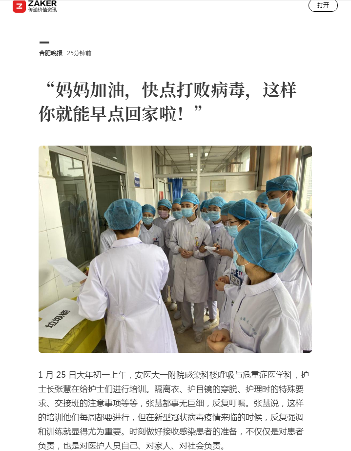 1 月 25 日大年初一上午,安医大一附院感染科楼呼吸与危重症医学科,护士长张慧在给护士们进行培训。隔离衣、护目镜的穿脱、护理时的特殊要求、交接班的注意事项等等,张慧都事无巨细,反复叮嘱。张慧说,这样的培训他们每周都要进行,但在新型冠状病毒疫情来临的时候,反复强调和训练就显得尤为重要。时刻做好接收感染患者的准备,不仅仅是对患者负责,也是对医护人员自己、对家人、对社会负责。