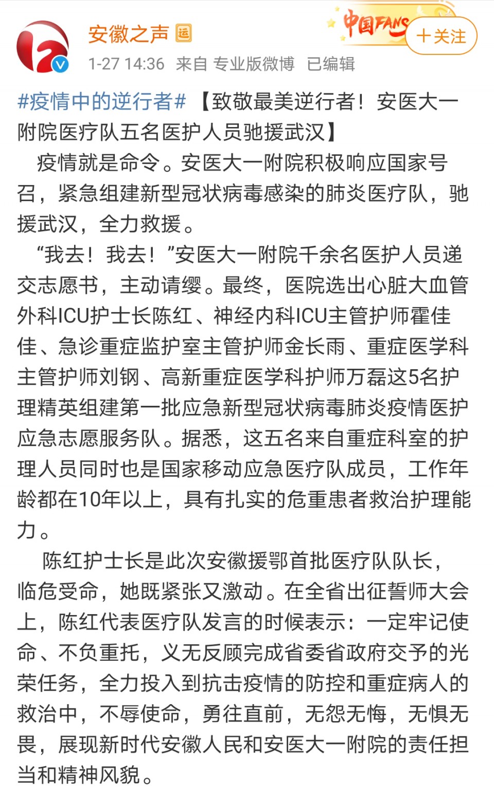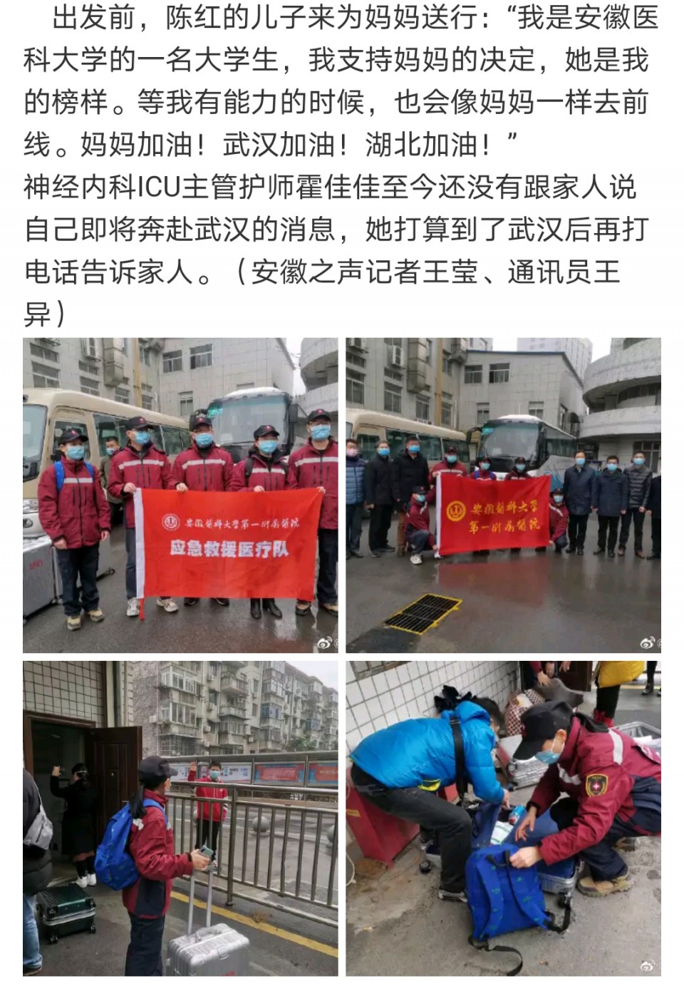 安徽之声:致敬最美逆行者!安医大一附院医疗队五名医护人员驰援武汉