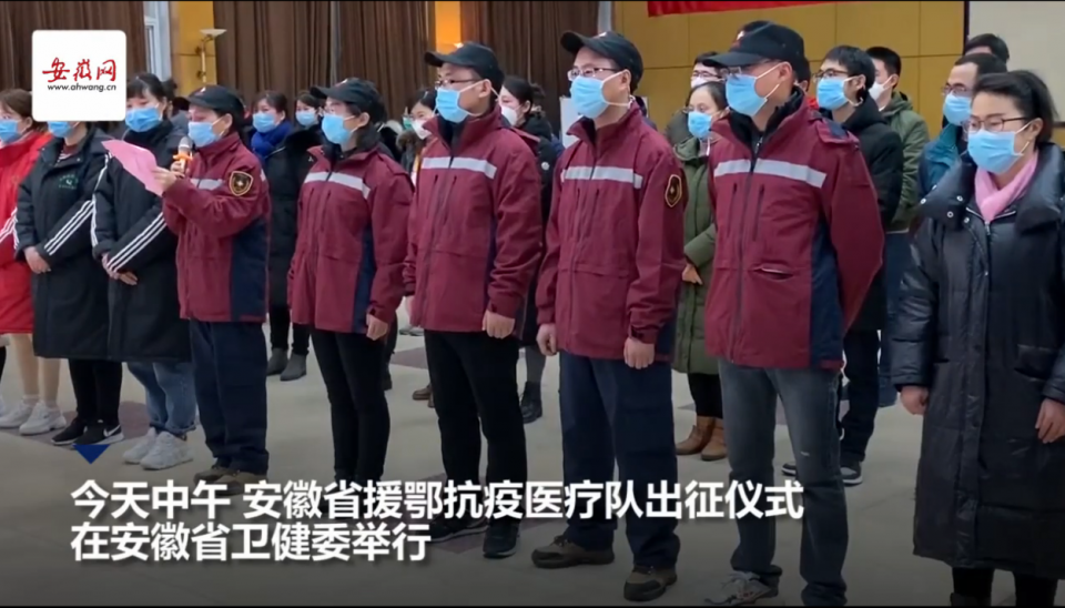 新安晚报安徽网大皖客户端讯1月27日中午,安徽省援鄂抗疫医疗队出征仪式在安徽省卫健委举行。我省五十名医护人员,将于今天下午奔赴武汉,参加疫情防控。