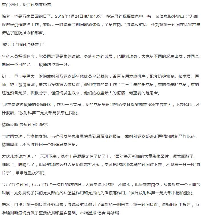 确诊新型冠状病毒感染的肺炎,肺部影像改变是重要诊断标准之一。面对疫情,安医大一附院放射科全体医务人员和党员干部职工,积极请战,奋斗在疫情防控第一线,全力保障人民群众的身体健康和生命安全。