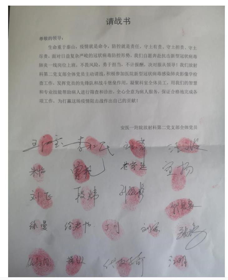 初一一早,安医大一附院放射科及党支部全体成员全部就位,设置专用发热机房,配套防护物资。技术员、医师、护士纷纷请缨,要求为发热病人做检查,他们中有的是工作了二三十年的老党员,有的是年轻党员,有的还是预备党员、积极分子,但疫情发生以来,他们的心里最大的疫情,最重要的是患者。