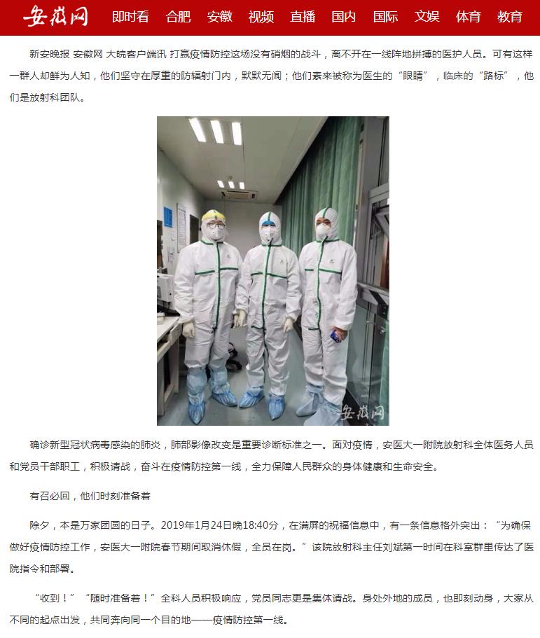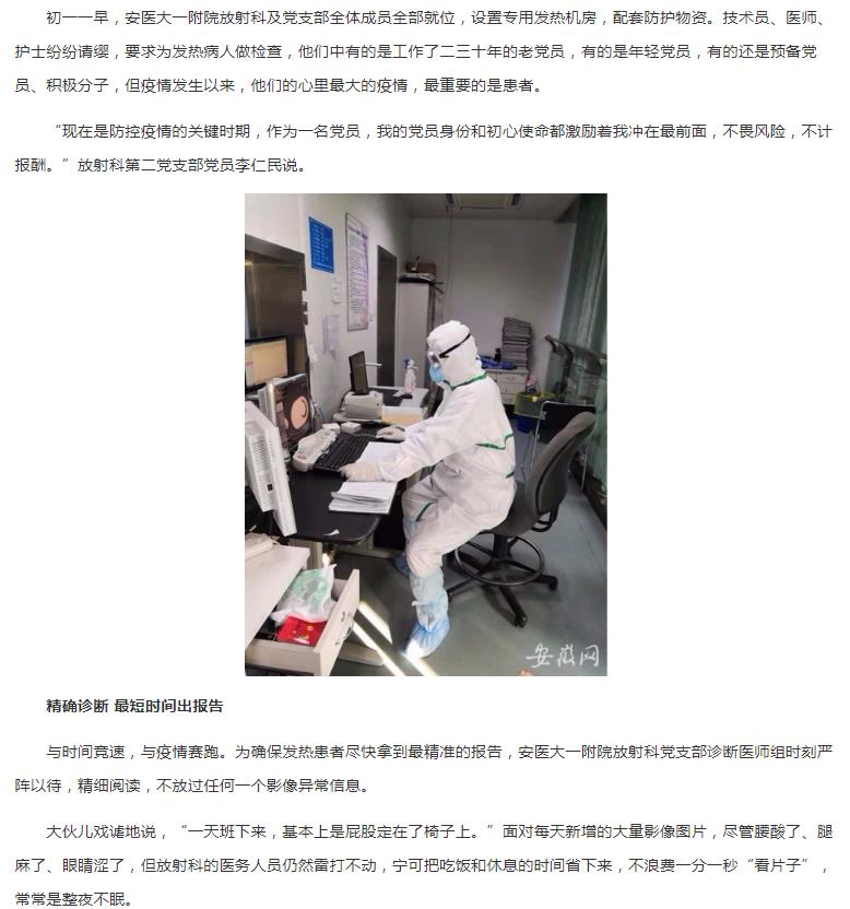 确诊新型冠状病毒感染的肺炎,肺部影像改变是重要诊断标准之一。面对疫情,安医大一附院放射科全体医务人员和党员干部职工,积极请战,奋斗在疫情防控第一线,全力保障人民群众的身体健康和生命安全。