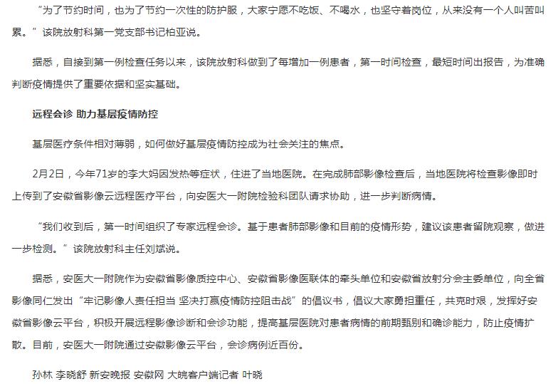 据悉,安医大一附院作为安徽省影像质控中心、安徽省影像医联体的牵头单位和安徽省放射分会主委单位,向全省影像同仁发出“牢记影像人责任担当 坚决打赢疫情防控阻击战”的倡议书,倡议大家勇担重任,共克时艰,发挥好安徽省影像云平台,积极开展远程影像诊断和会诊功能,提高基层医院对患者病情的前期甄别和确诊能力,防止疫情扩散。目前,安医大一附院通过安徽影像云平台,会诊病例近百份。