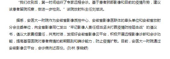 “我们收到后,第一时间组织了专家远程会诊。基于患者肺部影像和目前的疫情形势,建议该患者留院观察,做进一步检测。”该院放射科主任刘斌说。