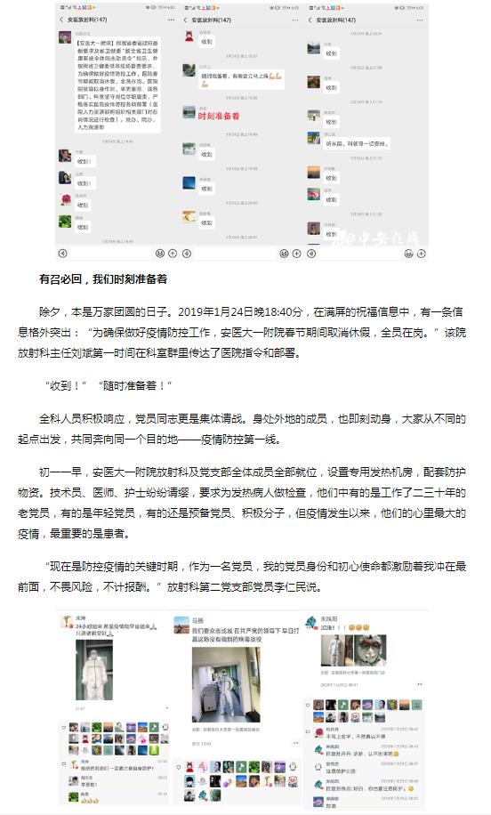除夕,本是万家团圆的日子。2019年1月24日晚18:40分,在满屏的祝福信息中,有一条信息格外突出:“为确保做好疫情防控工作,安医大一附院春节期间取消休假,全员在岗。”该院放射科主任刘斌第一时间在科室群里传达了医院指令和部署。