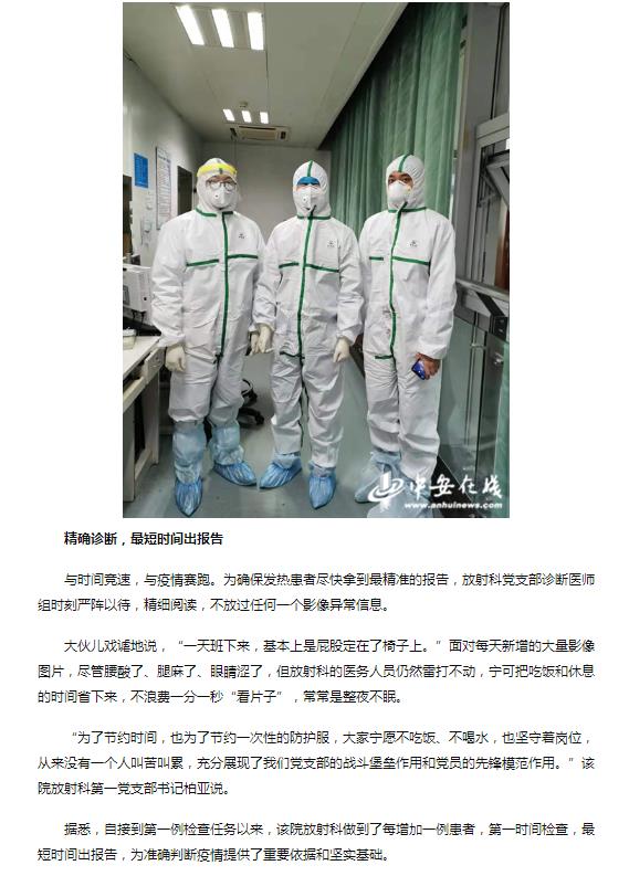 确诊新型冠状病毒感染的肺炎,肺部影像改变是重要诊断标准之一。面对疫情,安医大一附院放射科全体医务人员和党员干部职工,积极请战,奋斗在疫情防控第一线,全力保障人民群众的身体健康和生命安全。