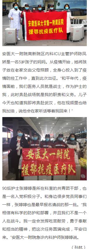 据了解,为全力支援湖北省开展新型冠状病毒感染的肺炎疫情救治工作,安医大一附院接到省卫健委紧急通知后,迅速行动,从众多请战的护理人员中,严格选拔,挑选出沈霞、张婷婷、陈凤娇3名政治素养高、业务熟练、技术能力强的护理人员组成援鄂队伍。这是医院继派出院感专家及第一批援鄂医疗队之后,再次组建医疗队驰援武汉。