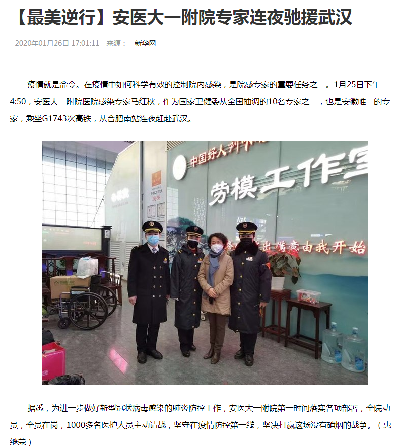 疫情就是命令。在疫情中如何科学有效的控制院内感染,是院感专家的重要任务之一。1月25日下午4:50,安医大一附院医院感染专家马红秋,作为国家卫健委从全国抽调的10名专家之一,也是安徽唯一的专家,乘坐G1743次高铁,从合肥南站连夜赶赴武汉。据悉,为进一步做好新型冠状病毒感染的肺炎防控工作,安医大一附院第一时间落实各项部署,全院动员,全员在岗,1000多名医护人员主动请战,坚守在疫情防控第一线,坚决打赢这场没有硝烟的战争。(惠继荣)