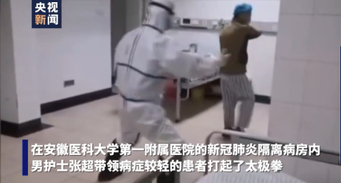 在安徽医科大学第一附属医院的新冠肺炎隔离病房内,男护士张超带领病症较轻的患者打起了太极拳,还有患者在病房内和张超进行了“武学研讨”。简单的太极拳招式不仅帮助患者适当锻炼身体,还帮他们树立了积极乐观的心态。