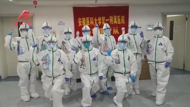 三八节前夕,安医大一附院支援湖北医疗队的女队员们收到了一份特殊的节日惊喜,白色的防护服被卡通画装点,花木兰、美少女战士、机器猫、海绵宝宝、小黄人、七仙女……医疗队里最年长的队员、59岁的徐爱晖主任穿上了“美少女战士”的白衣战袍:“我要代表人类,消灭病毒!”她说,这件“新衣”是最珍贵、最值得纪念的三八节礼物。