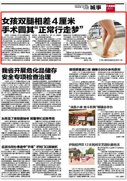 本报讯 今年刚满10岁的女孩婷婷最近脸上多了不少笑容。近日记者在安医大一附院骨科病房见到她时婷婷原本长度差距4厘米的双腿已恢复一致,正在进行康复锻炼。据为其手术的该院骨科主治医师曹坤介绍,大约经过半年时间的恢复,婷婷就可以和普通人一样正常行走。
