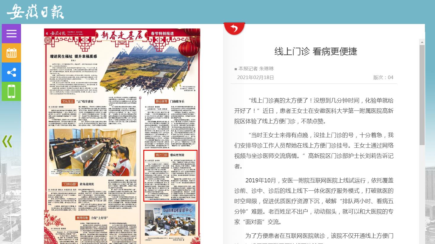 2019年10月,安医一附院互联网医院上线试运行,依托覆盖诊前、诊中、诊后的线上线下一体化医疗服务模式,打破就医的时空局限,促进优质医疗资源下沉,破解“排队两小时、看病五分钟”难题。老百姓足不出户,动动指头,就可以和大医院的专家“面对面”交流。
