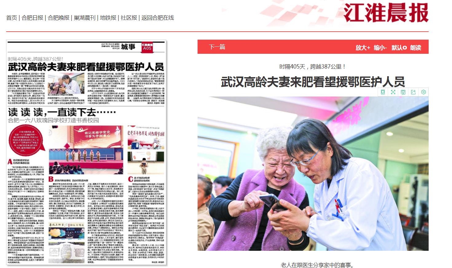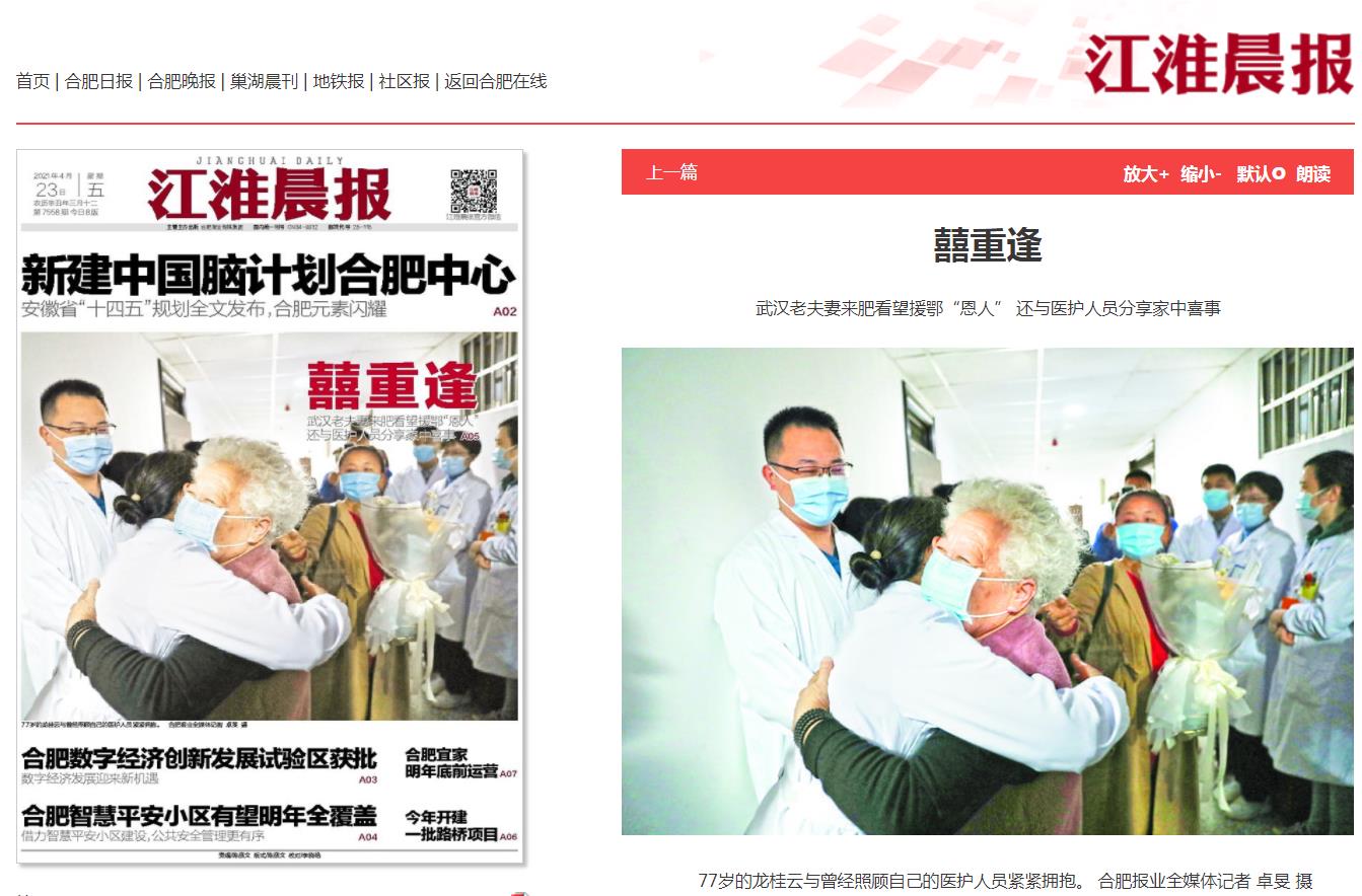 这一次从湖北武汉专程前来合肥寻找恩人——安医一附院的医护人员,想说一声“谢谢”和“对不起”。“谢谢你们,谢谢你们救了我们老两口。”龙奶奶两眼含泪说,“看病期间因为有一段没看到爷爷我还骂了他们,后来才知道我错怪了他们。”