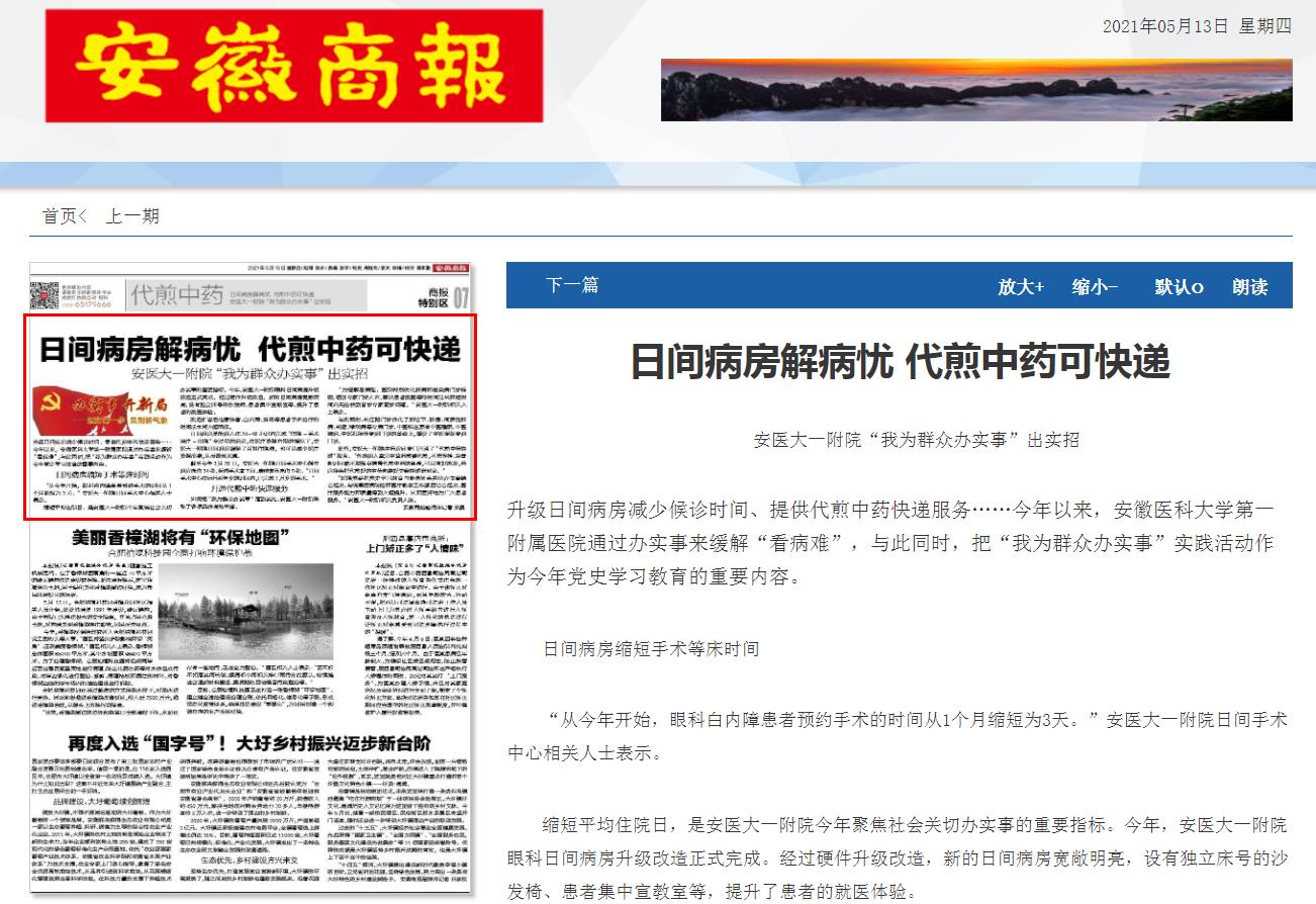 升级日间病房减少候诊时间、提供代煎中药快递服务……今年以来,安徽医科大学第一附属医院通过办实事来缓解“看病难”,与此同时,把“我为群众办实事”实践活动作为今年党史学习教育的重要内容。