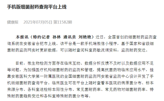 本报讯(特约记者 孙林 通讯员 刘艳艳)近日,全国首创的细菌耐药监测查询系统在安徽省合肥市上线该平台是一款手机端微信小程序,基于国家和省级细菌耐药监测网实时更新数据,可以随时查阅科室药敏流调资料,监测耐药变迁。