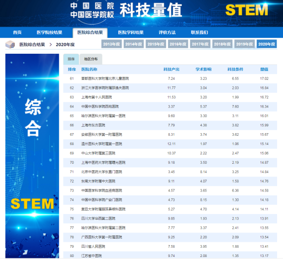 据悉,中国医院科技量值排行于2014-2020年连续发布,受到社会广泛关注。沿用统一标准、统一来源、统一方法,从科技产出、学术影响和科技条件三个维度构建评价体系,其中,科技产出维度包括期刊论文、专利和标准以及论文引用等;学术影响维度包括科技奖项、杰出人才以及学术任职等;科技条件维度包括科研项目和科研平台等。