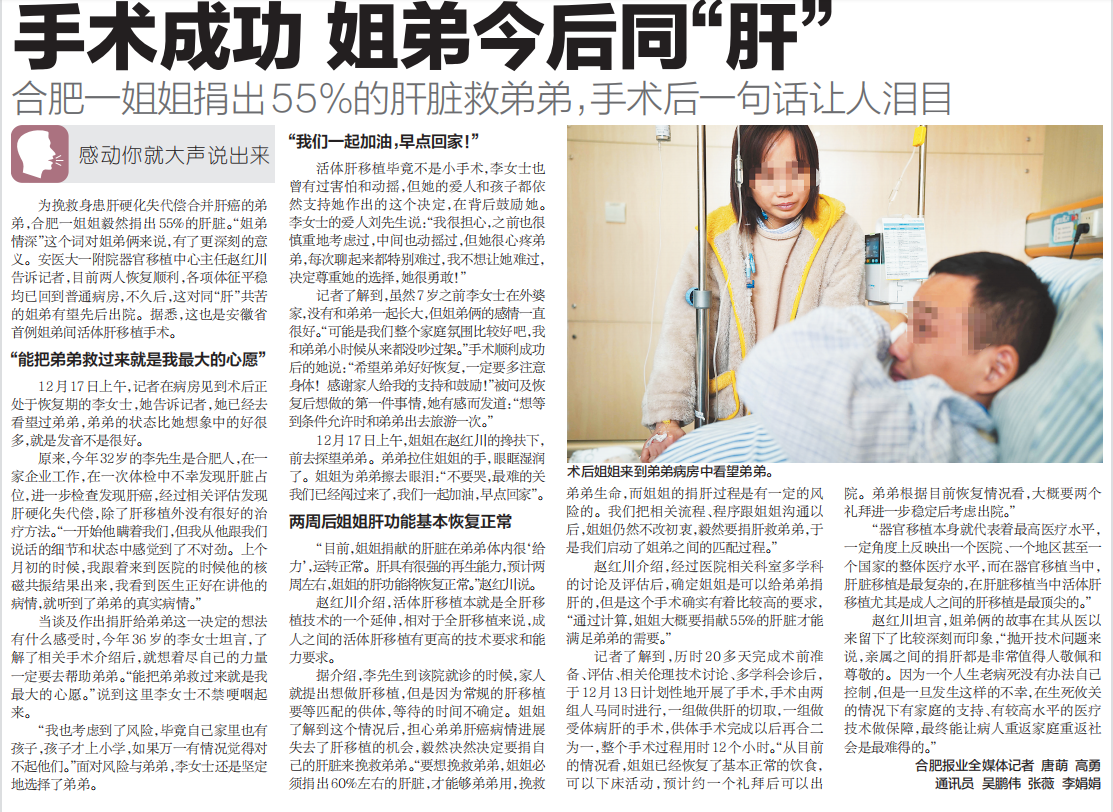 为挽救身患肝硬化失代偿合并肝癌的弟弟,合肥一姐姐毅然捐出55%的肝脏。“姐弟情深”这个词对姐弟俩来说,有了更深刻的意义。安医大一附院器官移植中心主任赵红川告诉记者,目前两人恢复顺利,各项体征平稳均已回到普通病房,不久后,这对同“肝”共苦的姐弟有望先后出院。据悉,这也是安徽省首例姐弟间活体肝移植手术。