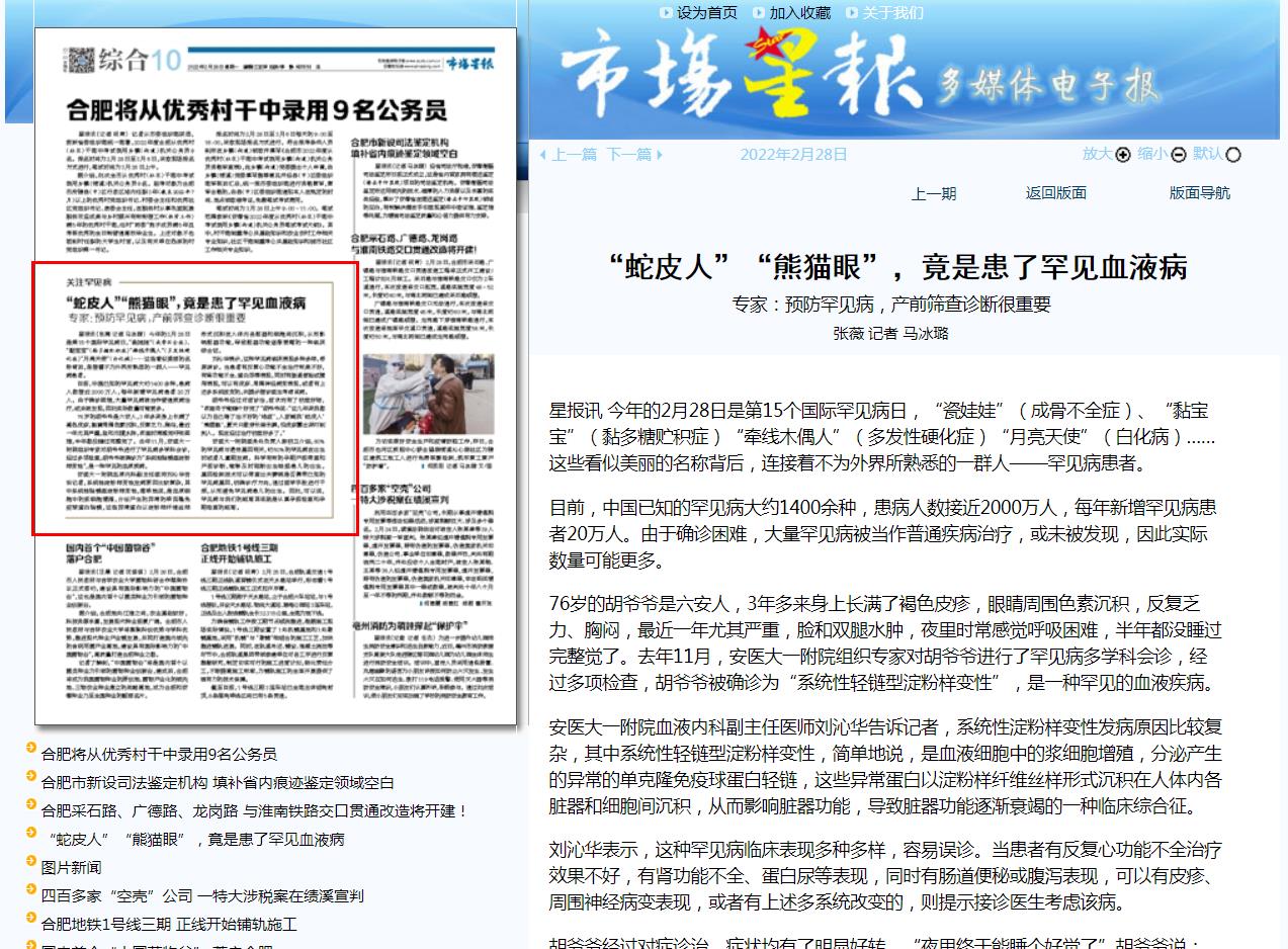 76岁的胡爷爷是六安人,3年多来身上长满了褐色皮疹,眼睛周围色素沉积,反复乏力、胸闷,最近一年尤其严重,脸和双腿水肿,夜里时常感觉呼吸困难,半年都没睡过完整觉了。去年11月,安医大一附院组织专家对胡爷爷进行了罕见病多学科会诊,经过多项检查,胡爷爷被确诊为“系统性轻链型淀粉样变性”,是一种罕见的血液疾病。