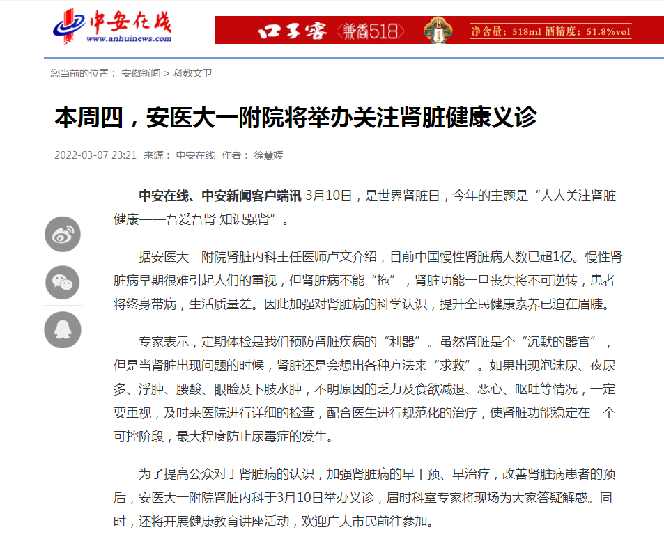 为了提高公众对于肾脏病的认识,加强肾脏病的早干预、早治疗,改善肾脏病患者的预后,安医大一附院肾脏内科于3月10日举办义诊,届时科室专家将现场为大家答疑解惑。同时,还将开展健康教育讲座活动,欢迎广大市民前往参加。