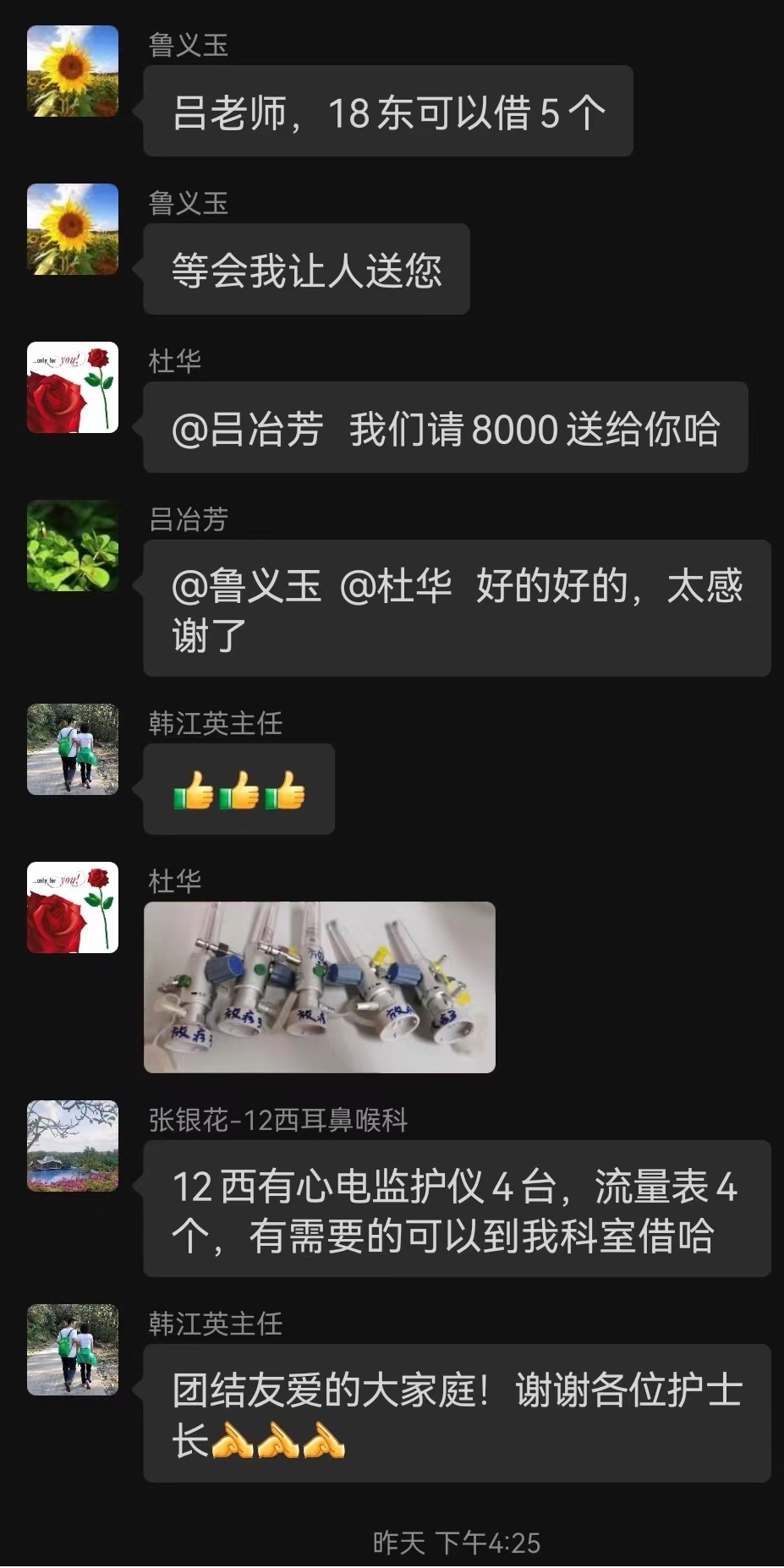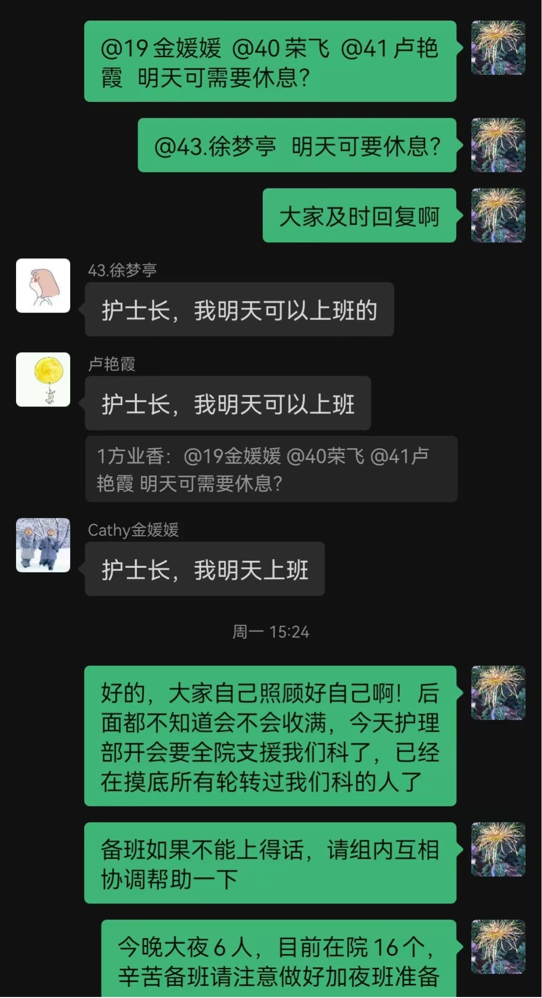 科室护理人员在护士长方业香带领下,最大限度的发挥了团队一贯的互帮互助精神,每天护士长在工作群看到的最多的回应是:“我可以上、我已经好了一些了,我可以......”,护士姚翔、王静发烧了还在坚持:“没事护士长我坚持把上午的班上完”,护士吴猛主动要求:“护士长,今晚我来替换备班,如果要加班就喊我......”