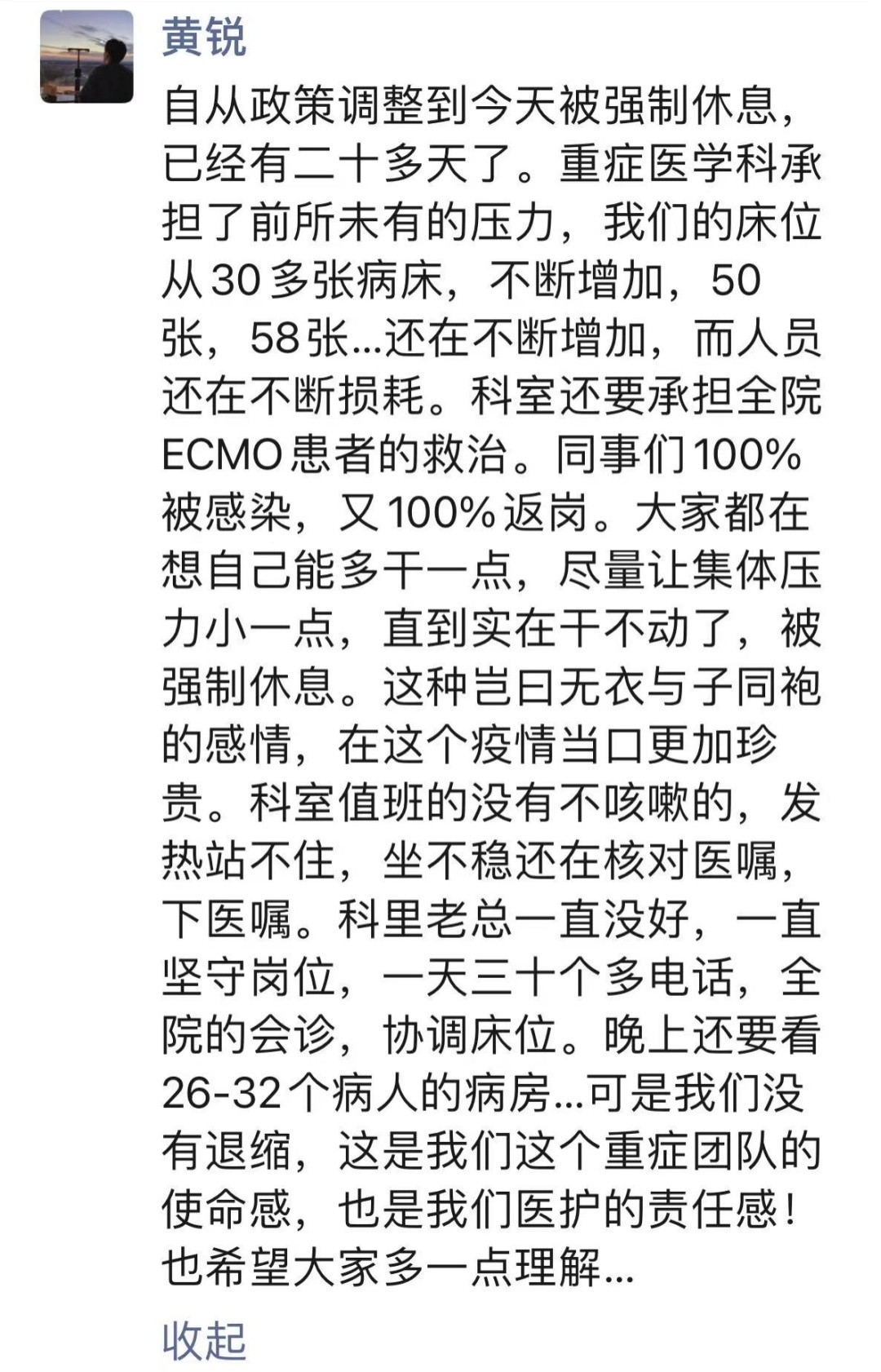 冲在一线的医护人员也没有逃脱病毒的侵袭,医生组全体感染,护理组也有近90%感染,面临严重的非战斗减员。大家轻伤不下火线,只要没有高热、全身酸疼爬不起来,就坚持在岗承担医疗护理任务。病区副主任彭晓春感染后没有休息一天,天天在岗;病区副主任许伦兵感染后出现肺炎表现却还在坚持给发热的一线班医生代班;ECMO小组成员身体还未恢复,却为了救治危重患者不分昼夜,应急而动,四天内完成三台ECMO、两台IABP上机手术,每次穿刺完都累得全身湿透。大家没有轻言放弃,始终牢记自己的职责使命所在,他们用自己的一言一行让患者和家属知道:有我们在,请放心!
