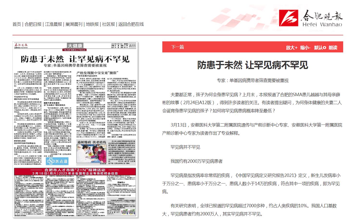 记者采访专家得知,目前罕见病的筛查和诊断率在不断提升,合肥多家医院可通过基因筛查技术,将罕见病预防关口前移,“防患于未然”。