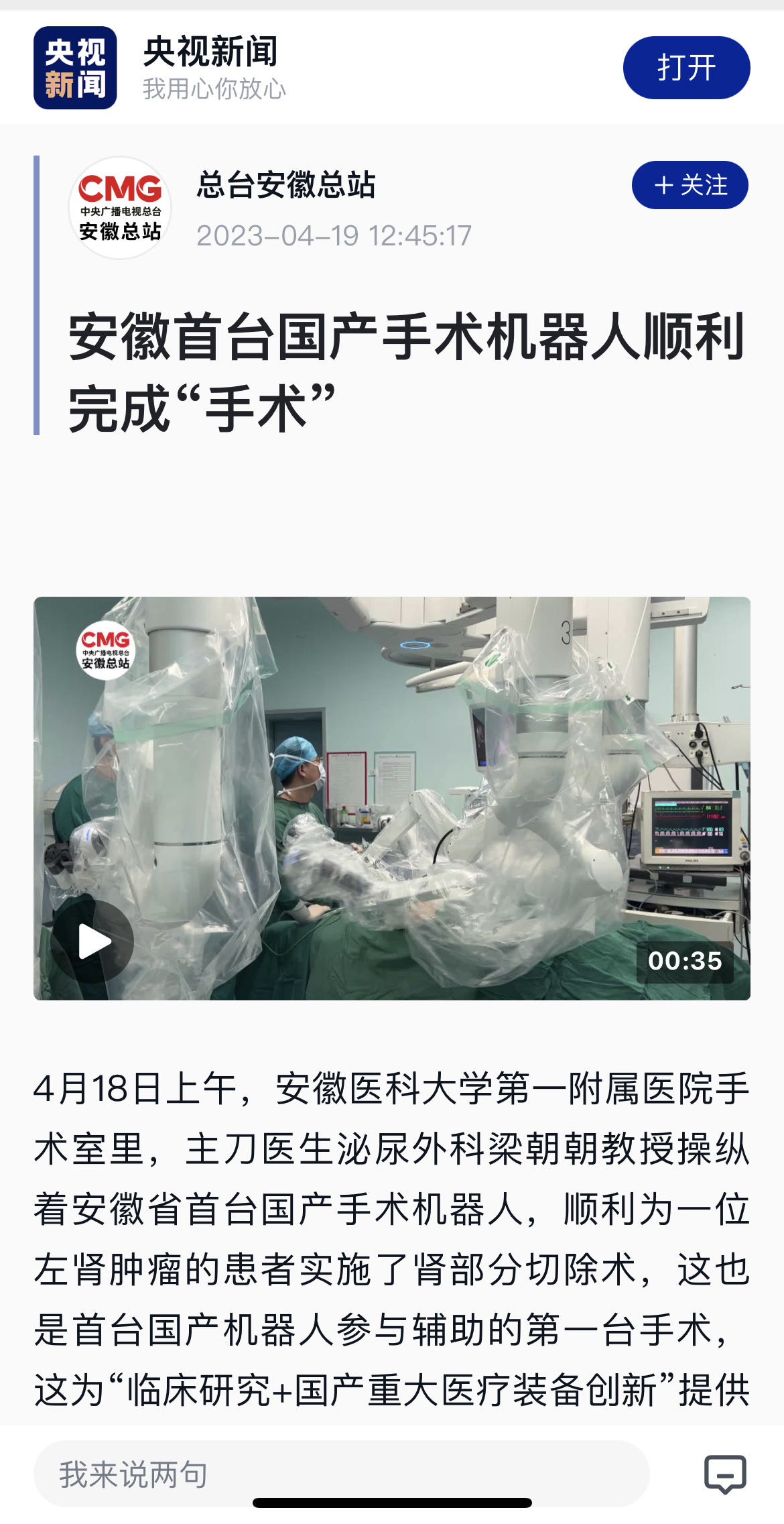 4月18日上午,安徽医科大学第一附属医院手术室里,主刀医生泌尿外科梁朝朝教授操纵着安徽省首台国产手术机器人,顺利为一位左肾肿瘤的患者实施了肾部分切除术,这也是首台国产机器人参与辅助的第一台手术,这为“临床研究+国产重大医疗装备创新”提供了新的探索模式。
