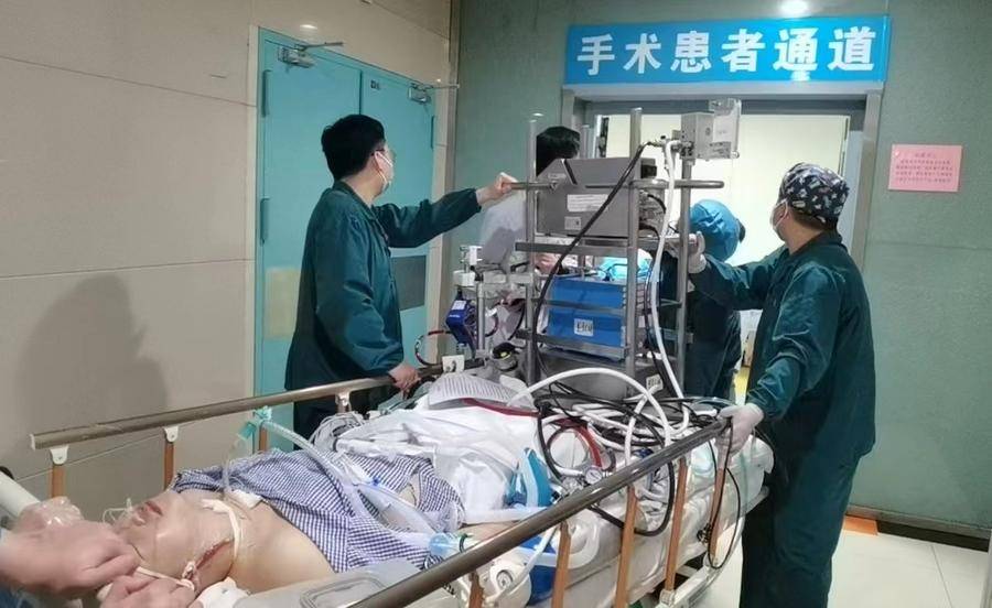 经过几个小时的努力,患者气道内的血终于暂时止住了,呼吸功能有所改善。然而患者还在ECMO的生命支持下,如何顺利送到手术室?唯一的办法就是携带ECMO转运。电梯空间不够,那大家就把机器抬起来!ECMO断电后电量不足,那就一路手动供能!