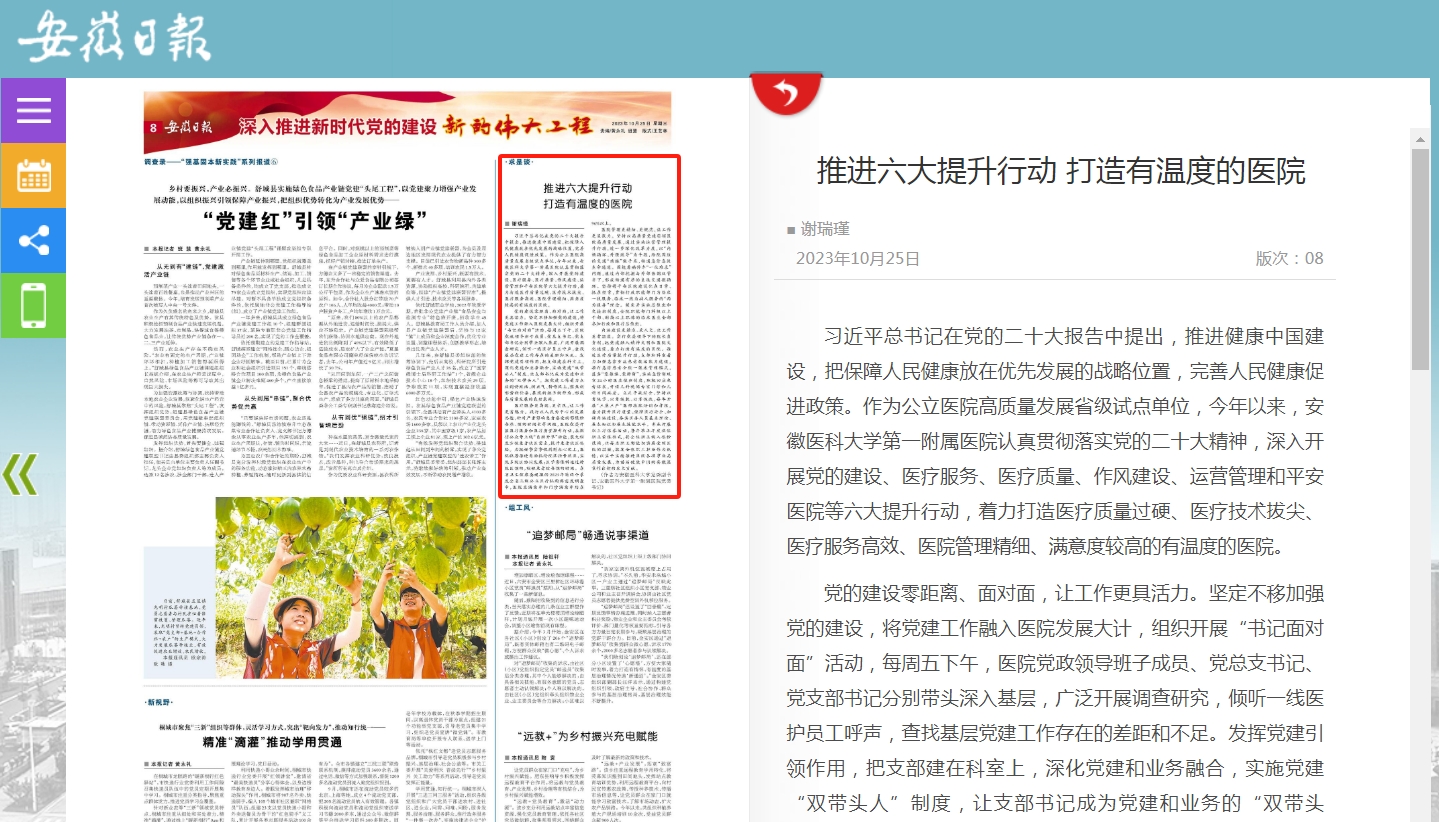 习近平总书记在党的二十大报告中提出,推进健康中国建设,把保障人民健康放在优先发展的战略位置,完善人民健康促进政策。作为公立医院高质量发展省级试点单位,今年以来,安徽医科大学第一附属医院认真贯彻落实党的二十大精神,深入开展党的建设、医疗服务、医疗质量、作风建设、运营管理和平安医院等六大提升行动,着力打造医疗质量过硬、医疗技术拔尖、医疗服务高效、医院管理精细、满意度较高的有温度的医院。