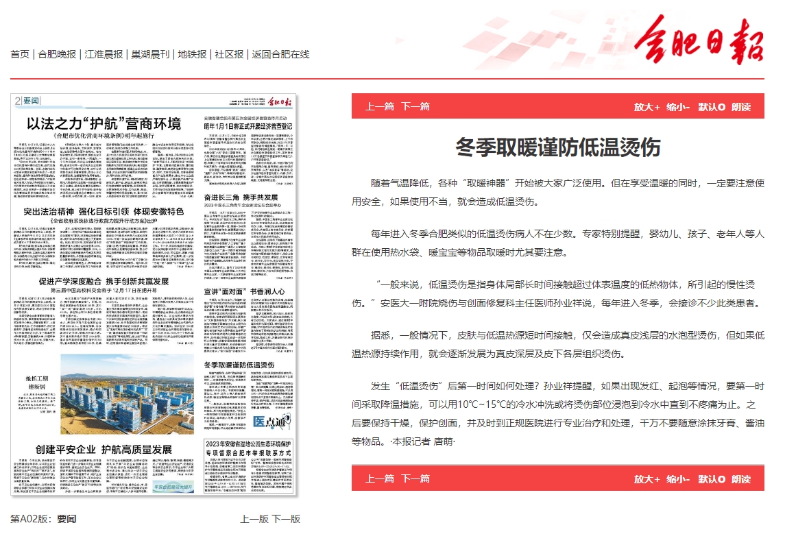 每年进入冬季合肥类似的低温烫伤病人不在少数。专家特别提醒,婴幼儿、孩子、老年人等人群在使用热水袋、暖宝宝等物品取暖时尤其要注意。