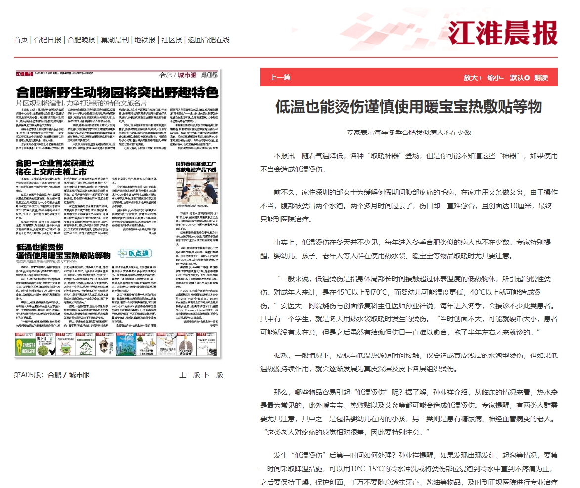 “一般来说,低温烫伤是指身体局部长时间接触超过体表温度的低热物体,所引起的慢性烫伤。对成年人来讲,是在45℃以上到70℃,而婴幼儿可能温度更低,40℃以上就可能造成烫伤。”安医大一附院烧伤与创面修复科主任医师孙业祥说,每年进入冬季,会接诊不少此类患者。其中有一个学生,就是冬天用热水袋取暖时发生的烫伤。“当时创面不大,可能就硬币大小,患者可能就没有太在意,但是之后虽然有结痂但伤口一直难以愈合,拖了半年左右才来就诊的。”