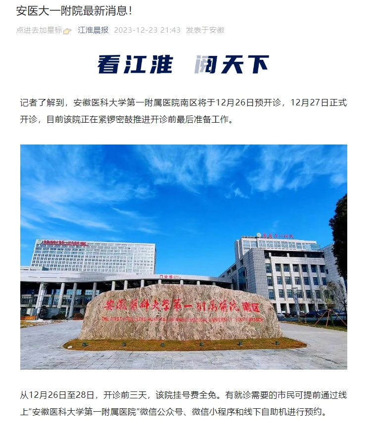 记者了解到,安徽医科大学第一附属医院南区将于12月26日预开诊,12月27日正式开诊,目前该院正在紧锣密鼓推进开诊前最后准备工作。