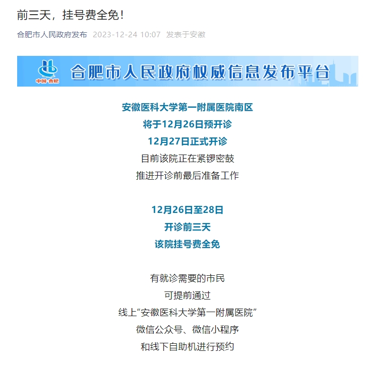 安徽医科大学第一附属医院南区将于12月26日预开诊12月27日正式开诊目前该院正在紧锣密鼓推进开诊前最后准备工作
