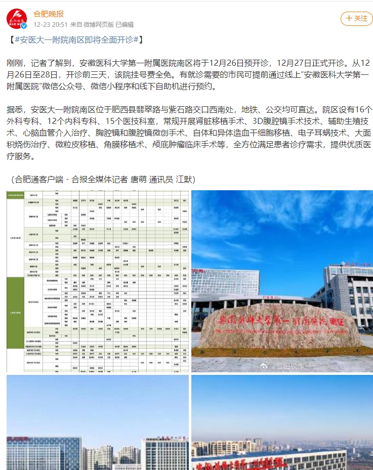 刚刚,记者了解到,安徽医科大学第一附属医院南区将于12月26日预开诊,12月27日正式开诊。从12月26日至28日,开诊前三天,该院挂号费全免。有就诊需要的市民可提前通过线上“安徽医科大学第一附属医院”微信公众号、微信小程序和线下自助机进行预约。