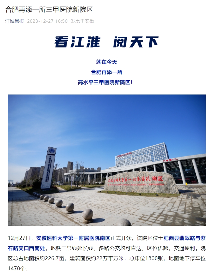12月27日,安徽医科大学第一附属医院南区正式开诊。该院区位于肥西县翡翠路与紫石路交口西南处。地铁三号线延长线、多路公交均可直达,区位优越,交通便利。院区总占地面积约226.7亩,建筑面积约22万平方米,总床位1800张,地面地下停车位1470个。