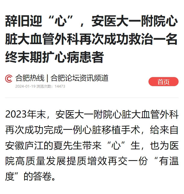 2023年末,安医大一附院心脏大血管外科再次成功完成一例心脏移植手术,给来自安徽庐江的夏先生带来“心”生,也为医院高质量发展提质增效再交一份“有温度”的答卷。