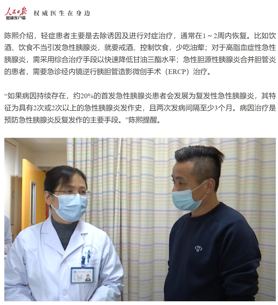 “如果病因持续存在,约20%的首发急性胰腺炎患者会发展为复发性急性胰腺炎,其特征为具有2次或2次以上的急性胰腺炎发作史,且两次发病间隔至少3个月。病因治疗是预防急性胰腺炎反复发作的主要手段。”陈熙提醒。