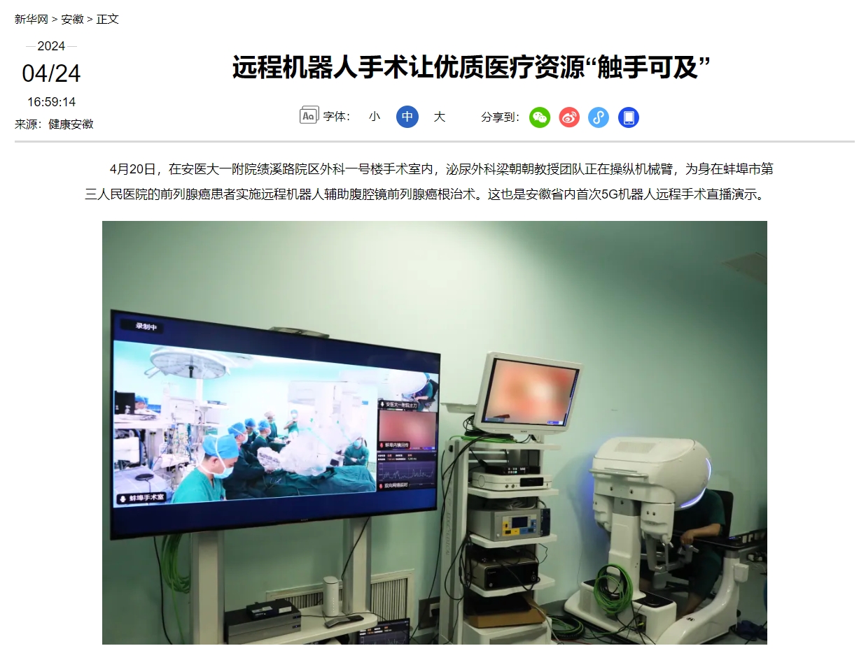此次手术采用的是国产手术机器人,画面通过合肥和蚌埠之间的“5G+固网专线”进行传输,通过搭载5G加互联网专线远程通信技术,实现了远程手术操作低延时、高精度、高可靠性的特殊要求。手术进行得非常顺利,充分展现了远程机器人手术的稳定性和安全性,为医疗资源的交互与下沉打下了坚实的基石。