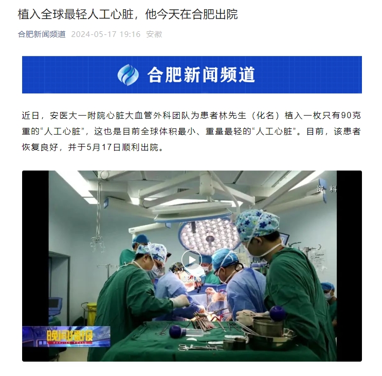 近日,安医大一附院心脏大血管外科团队为患者林先生(化名)植入一枚只有90克重的“人工心脏”,这也是目前全球体积最小、重量最轻的“人工心脏”。目前,该患者恢复良好,并于5月17日顺利出院。