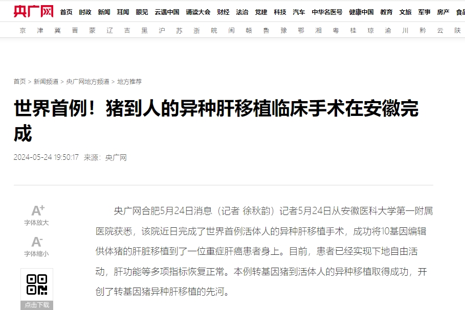 央广网合肥5月24日消息(记者 徐秋韵)记者5月24日从安徽医科大学第一附属医院获悉,该院近日完成了世界首例活体人的异种肝移植手术,成功将10基因编辑供体猪的肝脏移植到了一位重症肝癌患者身上。目前,患者已经实现下地自由活动,肝功能等多项指标恢复正常。本例转基因猪到活体人的异种移植取得成功,开创了转基因猪异种肝移植的先河。