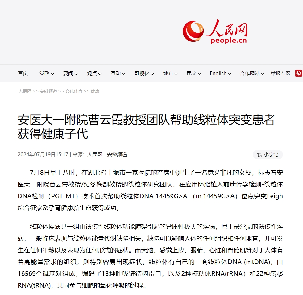 7月8日早上八时,在湖北省十堰市一家医院的产房中诞生了一名意义非凡的女婴,标志着安医大一附院曹云霞教授/纪冬梅副教授的线粒体研究团队,在应用胚胎植入前遗传学检测-线粒体DNA检测(PGT-MT)技术首次帮助线粒体DNA 14459G>A (m.14459G>A)位点突变Leigh综合征家系孕育健康新生命获得成功。