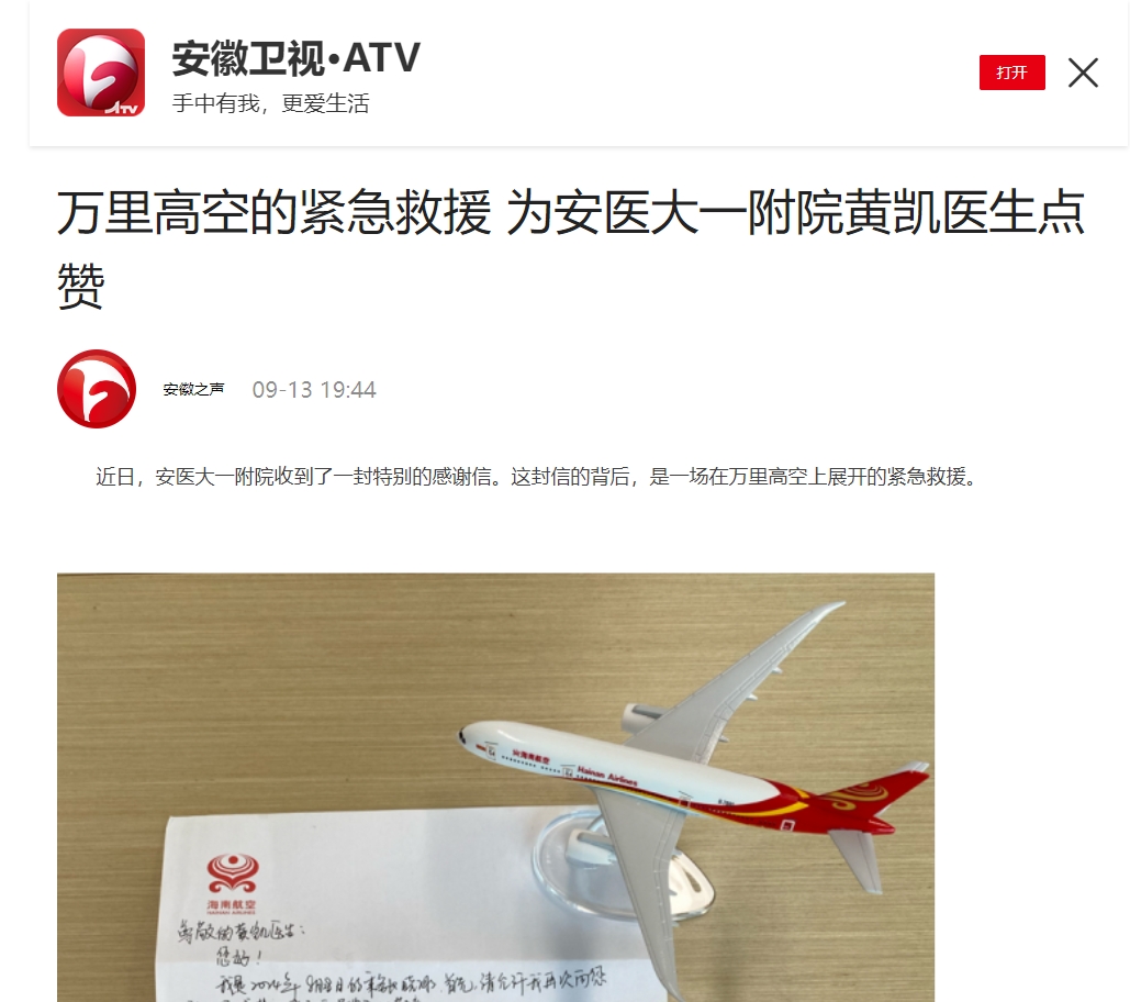 几天后,黄凯突然收到了一架飞机模型,与飞机模型放在一起的还有一封感谢信。信中,HU7633航班的乘务长张晓冰写道:“再次感谢您的无私帮助,愿您在医学的道路上继续创造更多的奇迹,为更多的人带来希望和健康。”(安徽之声记者汪菲,通讯员赵丽媛)