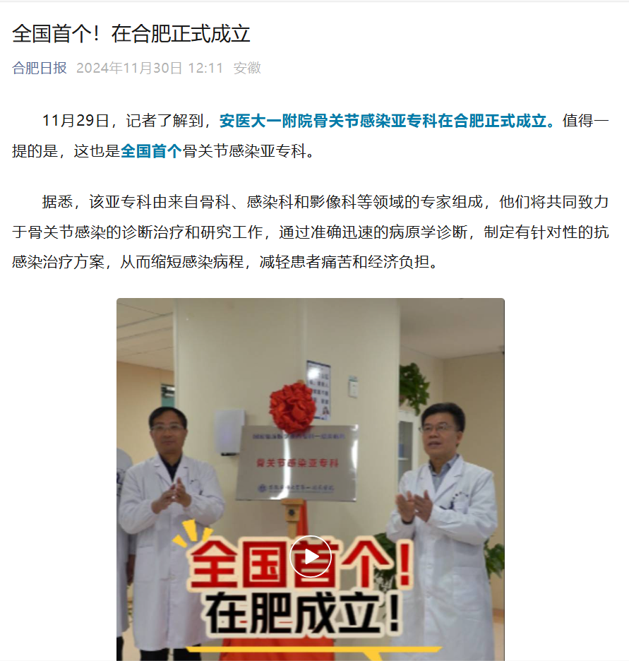 11月29日,记者了解到,安医大一附院骨关节感染亚专科在合肥正式成立。值得一提的是,这也是全国首个骨关节感染亚专科。