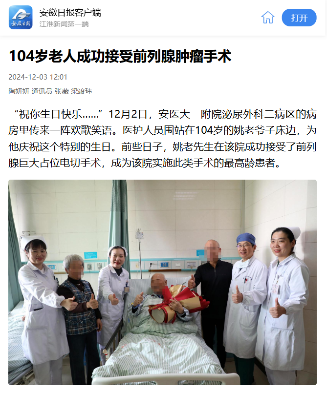 “祝你生日快乐……”12月2日,安医大一附院泌尿外科二病区的病房里传来一阵欢歌笑语。医护人员围站在104岁的姚老爷子床边,为他庆祝这个特别的生日。前些日子,姚老先生在该院成功接受了前列腺巨大占位电切手术,成为该院实施此类手术的最高龄患者。