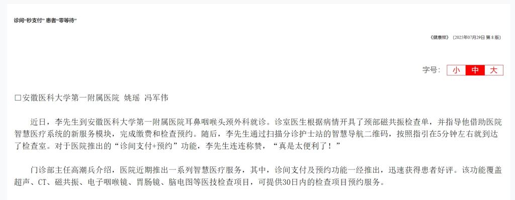 近日,李先生到安徽医科大学第一附属医院耳鼻咽喉头颈外科就诊。诊室医生根据病情开具了颈部磁共振检查单,并指导他借助医院智慧医疗系统的新服务模块,完成缴费和检查预约。随后,李先生通过扫描分诊护士站的智慧导航二维码,按照指引在5分钟左右就到达了检查室。对于医院推出的“诊间支付+预约”功能,李先生连连称赞,“真是太便利了!”